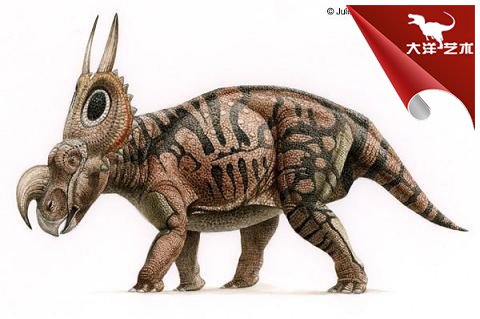 野牛龍生活在白堊紀晚期,大約6 米長、1米高,頭部有三只大角,脖子上有一個大頸盾,邊緣有齒狀骨質突起。它是由山普森(Sampson)在1994年發(fā)現(xiàn)的三個頭骨化石命名的。像其它角龍一樣,它在獸群中穿行,有牙齒,能咀嚼最硬的植物。