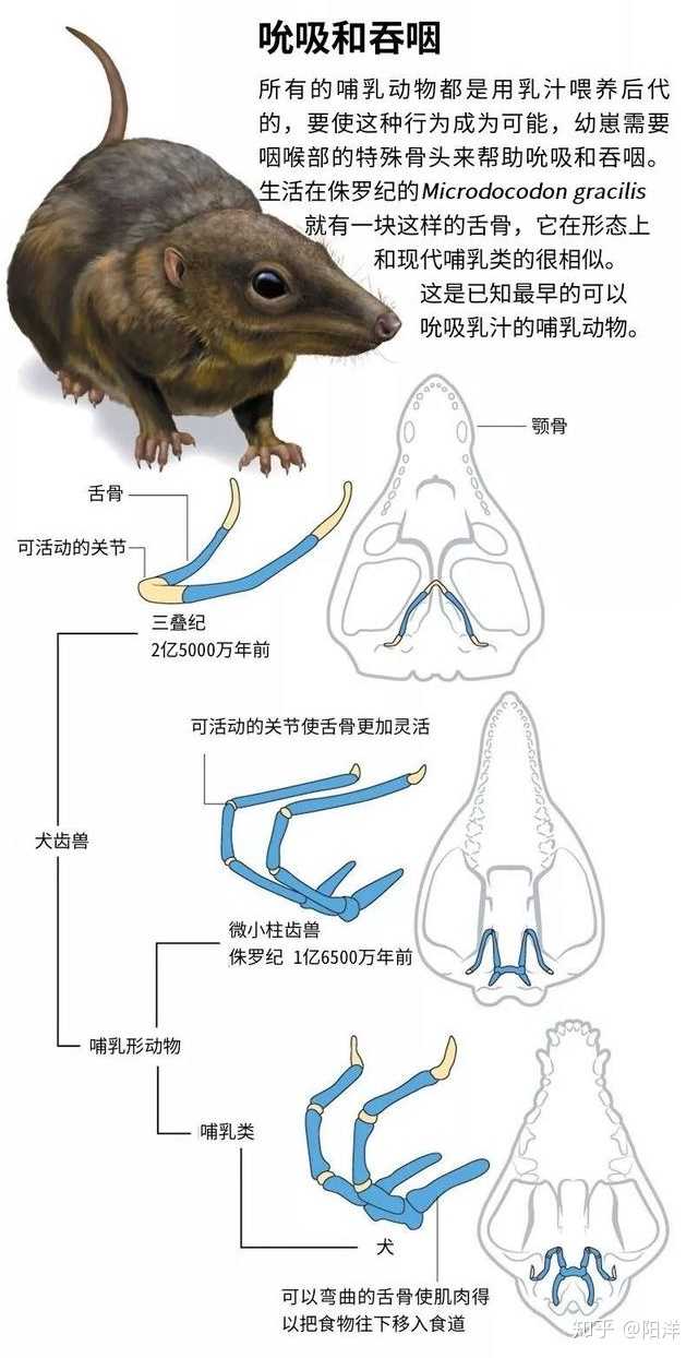 哺乳現(xiàn)象出現(xiàn)得相當(dāng)早,鴨嘴獸等單孔目說(shuō)明在哺乳類還是卵生的時(shí)候就已經(jīng)進(jìn)化出這項(xiàng)能力了,但究竟起于何時(shí)卻一直沒(méi)有定論,許多發(fā)現(xiàn)的早期化石例如三尖齒叉獸是沒(méi)有這個(gè)舌骨結(jié)構(gòu)的,這也就意味著它們并不哺乳,也就不是名副其實(shí)的“哺乳”動(dòng)物。