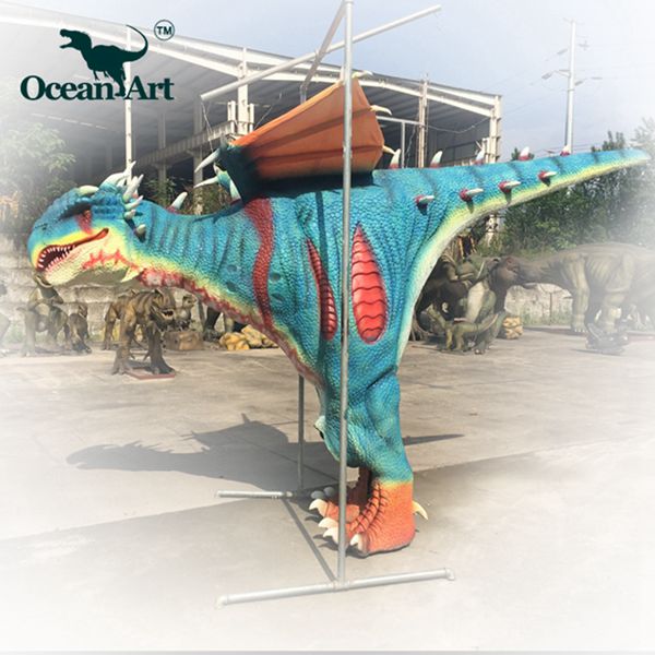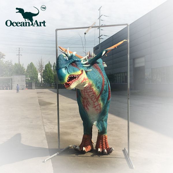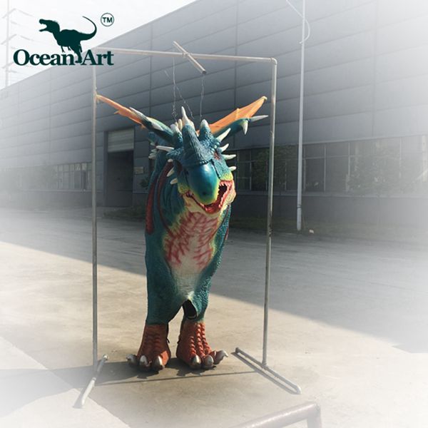 1.人控恐龍分為藏腿或露腿兩種設(shè)計(jì),服裝長(zhǎng)約4米,重20千克。藏腿恐龍服在腿和腹部處有一條拉鏈,當(dāng)操作者穿好后,拉上拉鏈便可完全遮住身影;露腿恐龍服則會(huì)把操作者雙腿露在外面。尾部有一條可抽出的長(zhǎng)桿,便于裝箱運(yùn)輸。另外,我們會(huì)提供一個(gè)支撐架,方便擺放恐龍服裝。